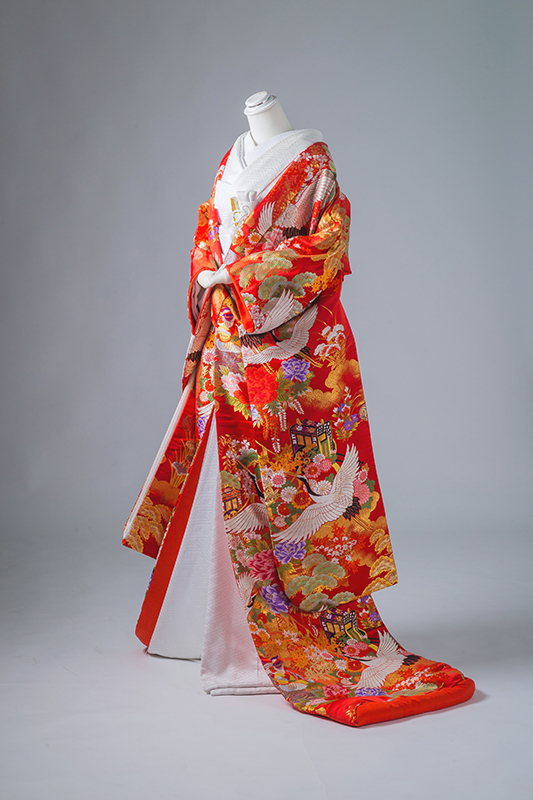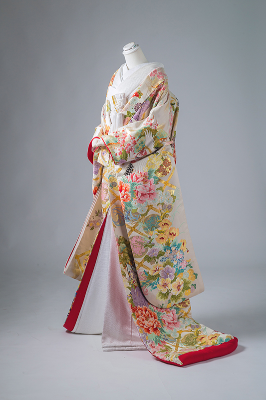 上のお写真 胸元の 華やかな カラー(色)の「掛下=打ち掛けの下に着る振袖」と