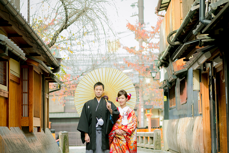 町家と石畳の 風情ある町並みは 和装にもよく似合いますね◎