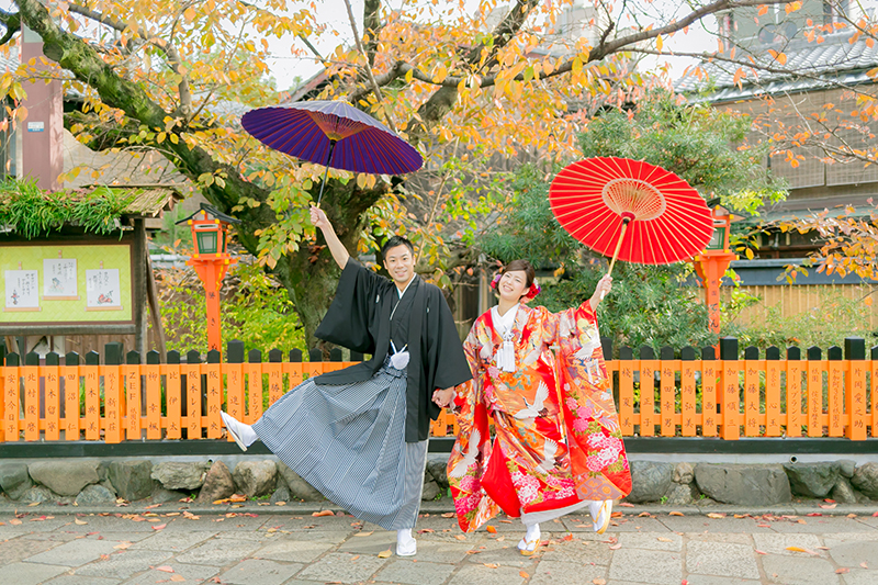 祇園ではこうした葉の色づきが お二人のお写真を彩ってくれますよ◎